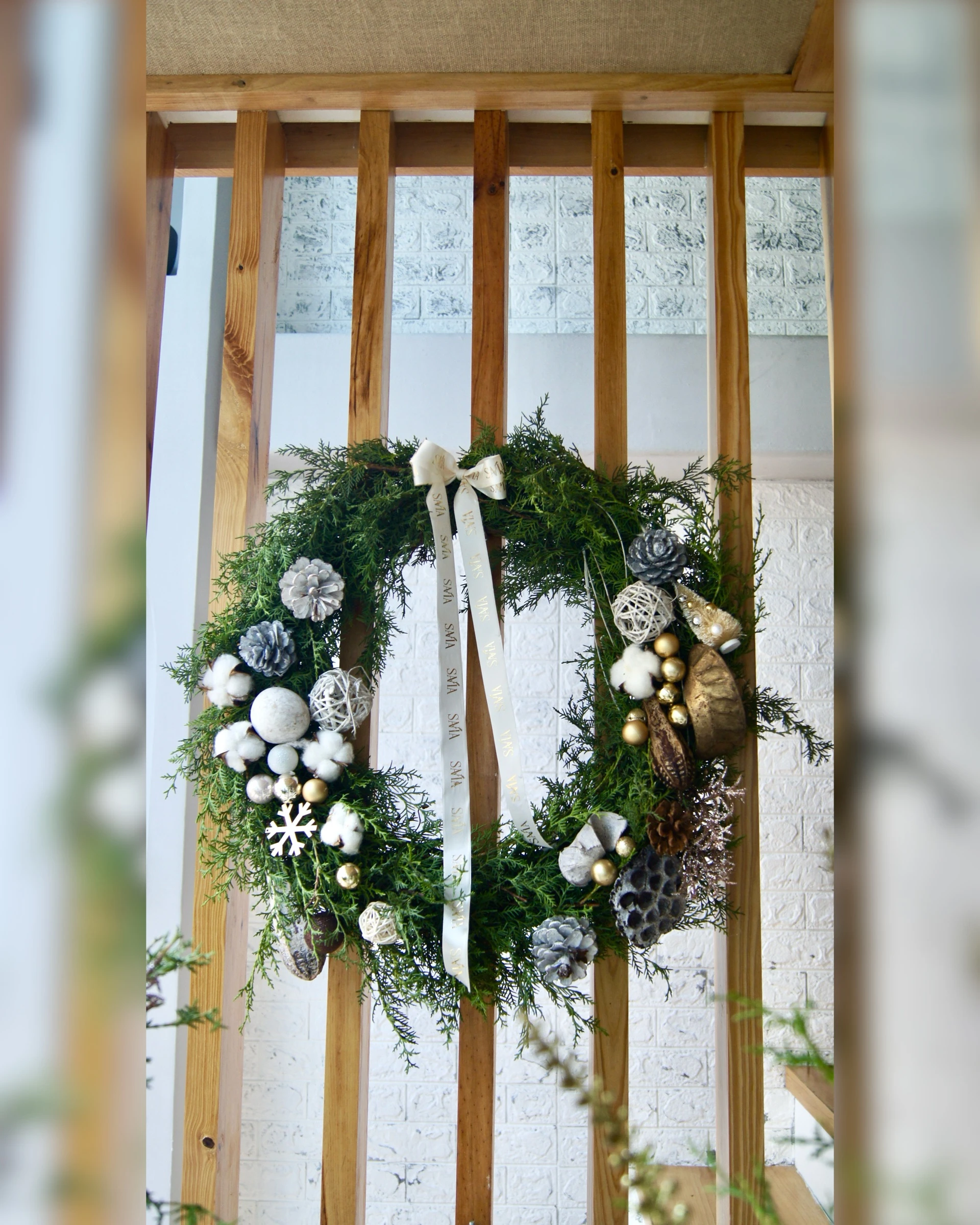 Esta espectacular corona es una obra maestra de estilo rústi- co-glam. Está exquisitamente decorada con elementos natu- rales como bellotas, piñas y bolitas de algodón, contrastados con toques de brillo dorado, plateado y un elegante lazo.